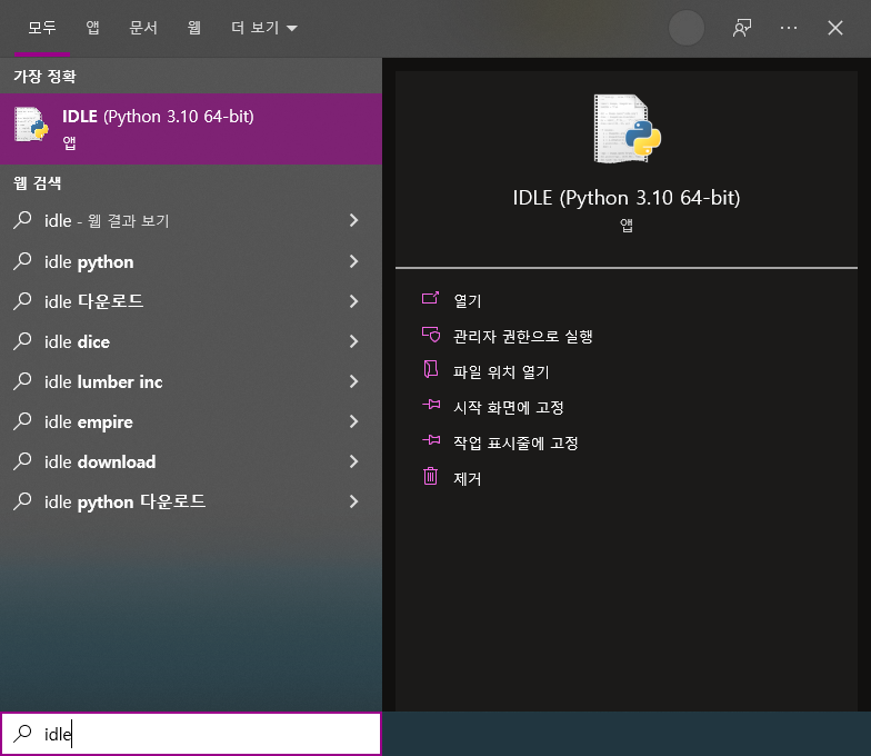 윈도우에 IDLE를 검색하여 IDLE (Python 3.10 64-bit)를 실행합니다.