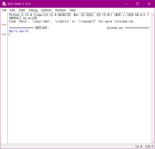 다음과 같이 Shell 창에 정상적으로 출력되는 것을 확인할 수 있습니다.