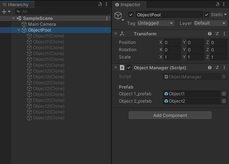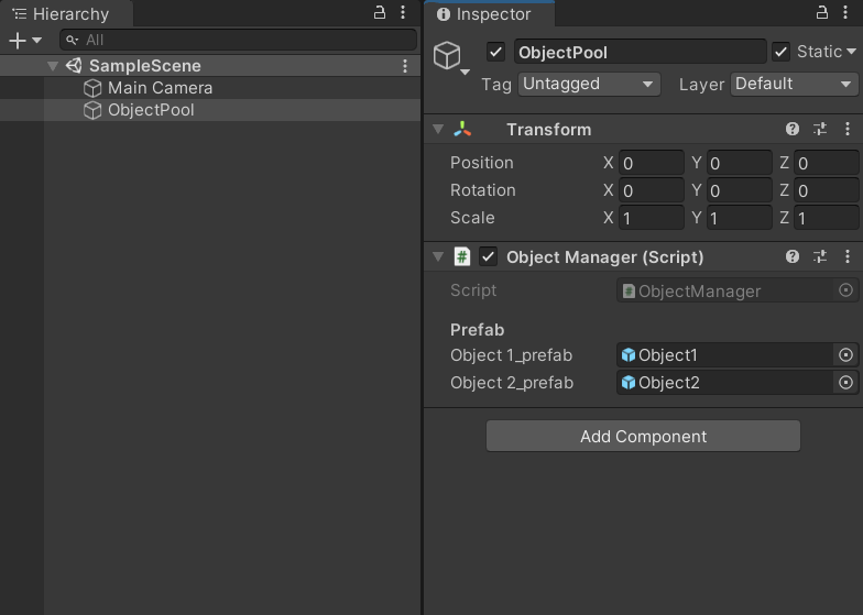 오브젝트 풀로 사용할 GameObject에 해당 스크립트를 추가하고 각 Prefab을 할당합니다.