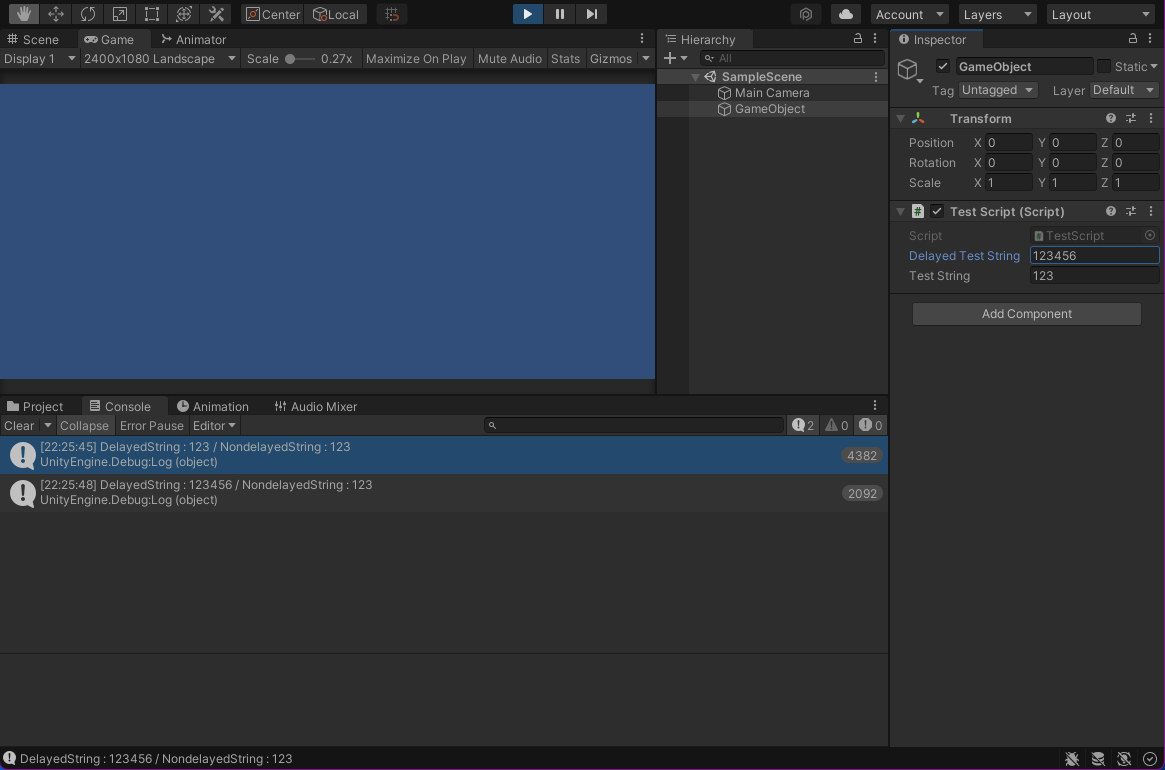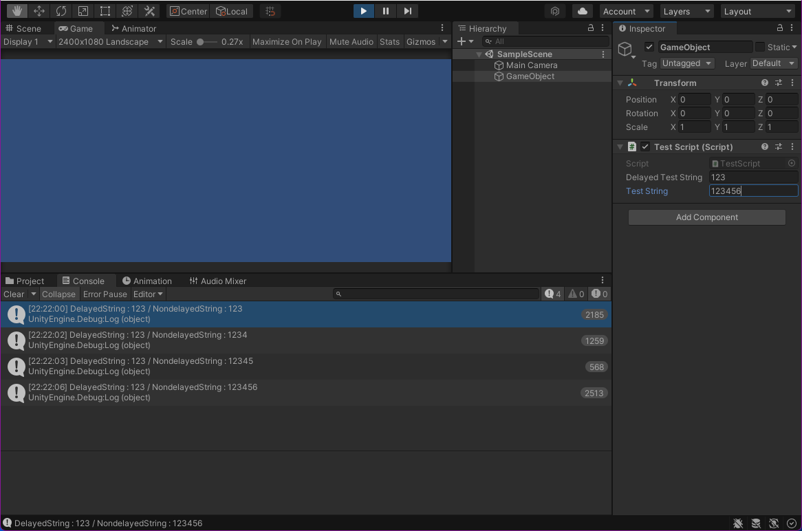 Debug.Log("DelayedString : " + delayedTestString + " / NondelayedString : " + testString);