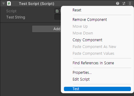 ContextMenu는 [Inspector 창]의 해당 스크립트 Component 메뉴에 명령을 추가하는 속성입니다.